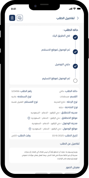 معرفة حالة الطلب لحظة بلحظة ومعرفة حالة النقل من البداية حتى التسليم النهائي